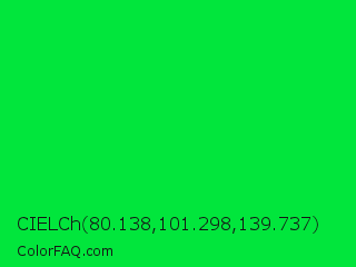 CIELCh 80.138,101.298,139.737 Color is a normal green color and the nearest color is Malachite #0bda51. Hex code #01e63c and RGB value is rgb(1,230,60). In RGB color space, this color is composed of 0% red, 90% green, 24% blue, In CMYK color space, this color is composed of 100% cyan, 0% magenta, 74% yellow , 10% black , In HSL color space, this color has a hue angle of 135° , 99% saturation and 45% lightness.