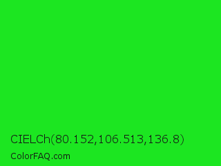 CIELCh 80.152,106.513,136.8 Color is a normal green color and the nearest color is Lime Green #32cd32. Hex code #1ce621 and RGB value is rgb(28,230,33). In RGB color space, this color is composed of 11% red, 90% green, 13% blue, In CMYK color space, this color is composed of 88% cyan, 0% magenta, 86% yellow , 10% black , In HSL color space, this color has a hue angle of 121° , 80% saturation and 51% lightness.