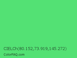 CIELCh 80.152,73.919,145.272 Color is a normal green color and the nearest color is Emerald #50c878. Hex code #53e174 and RGB value is rgb(83,225,116). In RGB color space, this color is composed of 33% red, 88% green, 45% blue, In CMYK color space, this color is composed of 63% cyan, 0% magenta, 48% yellow , 12% black , In HSL color space, this color has a hue angle of 134° , 70% saturation and 60% lightness.