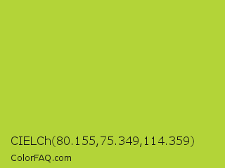 CIELCh 80.155,75.349,114.359 Color is a normal lime color and the nearest color is Android Green #a4c639. Hex code #b3d438 and RGB value is rgb(179,212,56). In RGB color space, this color is composed of 70% red, 83% green, 22% blue, In CMYK color space, this color is composed of 16% cyan, 0% magenta, 74% yellow , 17% black , In HSL color space, this color has a hue angle of 73° , 64% saturation and 53% lightness.
