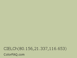 CIELCh 80.156,21.337,116.653 Color is a light lime color and the nearest color is Thistle Green #cccaa8. Hex code #c3cba3 and RGB value is rgb(195,203,163). In RGB color space, this color is composed of 76% red, 80% green, 64% blue, In CMYK color space, this color is composed of 4% cyan, 0% magenta, 20% yellow , 20% black , In HSL color space, this color has a hue angle of 72° , 28% saturation and 72% lightness.