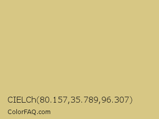 CIELCh 80.157,35.789,96.307 Color is a light yellow color and the nearest color is Straw #d4bf8d. Hex code #d7c784 and RGB value is rgb(215,199,132). In RGB color space, this color is composed of 84% red, 78% green, 52% blue, In CMYK color space, this color is composed of 0% cyan, 7% magenta, 39% yellow , 16% black , In HSL color space, this color has a hue angle of 48° , 51% saturation and 68% lightness.