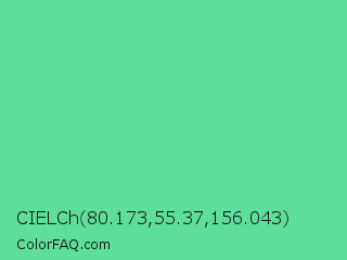 CIELCh 80.173,55.37,156.043 Color is a light green color and the nearest color is Medium Aquamarine #66ddaa. Hex code #5ede9b and RGB value is rgb(94,222,155). In RGB color space, this color is composed of 37% red, 87% green, 61% blue, In CMYK color space, this color is composed of 58% cyan, 0% magenta, 30% yellow , 13% black , In HSL color space, this color has a hue angle of 149° , 66% saturation and 62% lightness.
