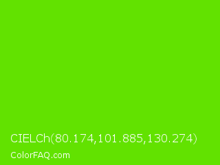 CIELCh 80.174,101.885,130.274 Color is a normal green color and the nearest color is Bright Green #66ff00. Hex code #62e200 and RGB value is rgb(98,226,0). In RGB color space, this color is composed of 38% red, 89% green, 0% blue, In CMYK color space, this color is composed of 57% cyan, 0% magenta, 100% yellow , 11% black , In HSL color space, this color has a hue angle of 94° , 100% saturation and 44% lightness.