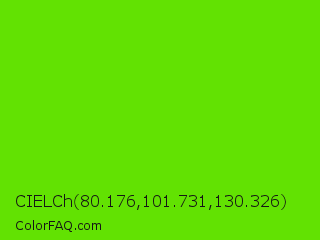 CIELCh 80.176,101.731,130.326 Color is a normal green color and the nearest color is Bright Green #66ff00. Hex code #62e202 and RGB value is rgb(98,226,2). In RGB color space, this color is composed of 38% red, 89% green, 1% blue, In CMYK color space, this color is composed of 57% cyan, 0% magenta, 99% yellow , 11% black , In HSL color space, this color has a hue angle of 94° , 98% saturation and 45% lightness.