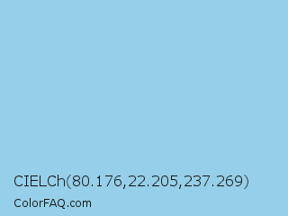 CIELCh 80.176,22.205,237.269 Color is a light blue color and the nearest color is Cornflower #93ccea. Hex code #96cfe9 and RGB value is rgb(150,207,233). In RGB color space, this color is composed of 59% red, 81% green, 91% blue, In CMYK color space, this color is composed of 36% cyan, 11% magenta, 0% yellow , 9% black , In HSL color space, this color has a hue angle of 199° , 65% saturation and 75% lightness.