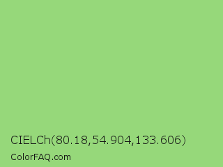 CIELCh 80.18,54.904,133.606 Color is a light green color and the nearest color is Feijoa #9fdd8c. Hex code #96d87a and RGB value is rgb(150,216,122). In RGB color space, this color is composed of 59% red, 85% green, 48% blue, In CMYK color space, this color is composed of 31% cyan, 0% magenta, 44% yellow , 15% black , In HSL color space, this color has a hue angle of 102° , 55% saturation and 66% lightness.