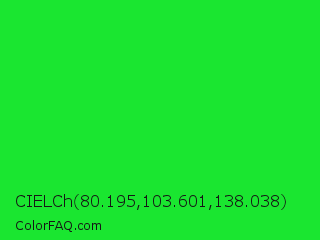 CIELCh 80.195,103.601,138.038 Color is a normal green color and the nearest color is Lime Green #32cd32. Hex code #1ae630 and RGB value is rgb(26,230,48). In RGB color space, this color is composed of 10% red, 90% green, 19% blue, In CMYK color space, this color is composed of 89% cyan, 0% magenta, 79% yellow , 10% black , In HSL color space, this color has a hue angle of 126° , 80% saturation and 50% lightness.