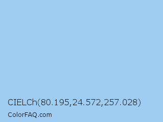 CIELCh 80.195,24.572,257.028 Color is a light blue color and the nearest color is Baby Blue Eyes #a1caf1. Hex code #9fccf3 and RGB value is rgb(159,204,243). In RGB color space, this color is composed of 62% red, 80% green, 95% blue, In CMYK color space, this color is composed of 35% cyan, 16% magenta, 0% yellow , 5% black , In HSL color space, this color has a hue angle of 208° , 78% saturation and 79% lightness.