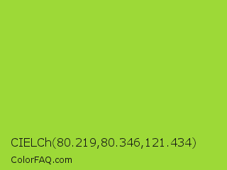 CIELCh 80.219,80.346,121.434 Color is a normal green color and the nearest color is Yellow Green #9acd32. Hex code #9dd937 and RGB value is rgb(157,217,55). In RGB color space, this color is composed of 62% red, 85% green, 22% blue, In CMYK color space, this color is composed of 28% cyan, 0% magenta, 75% yellow , 15% black , In HSL color space, this color has a hue angle of 82° , 68% saturation and 53% lightness.