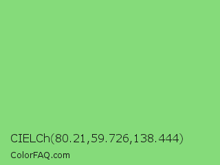 CIELCh 80.21,59.726,138.444 Color is a light green color and the nearest color is Pastel Green #77dd77. Hex code #85db7a and RGB value is rgb(133,219,122). In RGB color space, this color is composed of 52% red, 86% green, 48% blue, In CMYK color space, this color is composed of 39% cyan, 0% magenta, 44% yellow , 14% black , In HSL color space, this color has a hue angle of 113° , 57% saturation and 67% lightness.