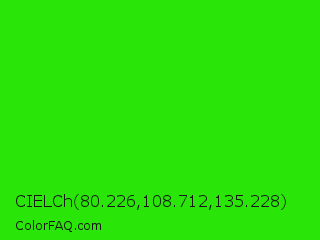 CIELCh 80.226,108.712,135.228 Color is a normal green color and the nearest color is Neon Green #39ff14. Hex code #29e608 and RGB value is rgb(41,230,8). In RGB color space, this color is composed of 16% red, 90% green, 3% blue, In CMYK color space, this color is composed of 82% cyan, 0% magenta, 97% yellow , 10% black , In HSL color space, this color has a hue angle of 111° , 93% saturation and 47% lightness.