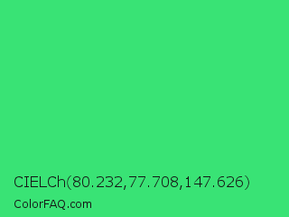 CIELCh 80.232,77.708,147.626 Color is a normal green color and the nearest color is UFO Green #3cd070. Hex code #39e375 and RGB value is rgb(57,227,117). In RGB color space, this color is composed of 22% red, 89% green, 46% blue, In CMYK color space, this color is composed of 75% cyan, 0% magenta, 48% yellow , 11% black , In HSL color space, this color has a hue angle of 141° , 75% saturation and 56% lightness.