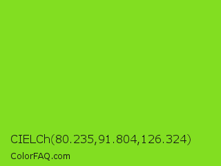 CIELCh 80.235,91.804,126.324 Color is a normal green color and the nearest color is Atlantis #97cd2d. Hex code #82de21 and RGB value is rgb(130,222,33). In RGB color space, this color is composed of 51% red, 87% green, 13% blue, In CMYK color space, this color is composed of 41% cyan, 0% magenta, 85% yellow , 13% black , In HSL color space, this color has a hue angle of 89° , 74% saturation and 50% lightness.