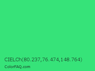 CIELCh 80.237,76.474,148.764 Color is a normal green color and the nearest color is UFO Green #3cd070. Hex code #36e379 and RGB value is rgb(54,227,121). In RGB color space, this color is composed of 21% red, 89% green, 47% blue, In CMYK color space, this color is composed of 76% cyan, 0% magenta, 47% yellow , 11% black , In HSL color space, this color has a hue angle of 143° , 76% saturation and 55% lightness.