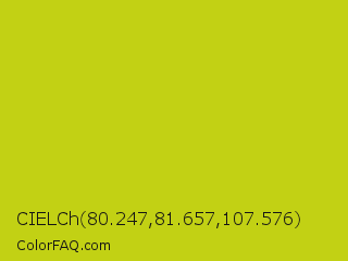 CIELCh 80.247,81.657,107.576 Color is a normal yellow color and the nearest color is Rio Grande #bbd009. Hex code #c2d114 and RGB value is rgb(194,209,20). In RGB color space, this color is composed of 76% red, 82% green, 8% blue, In CMYK color space, this color is composed of 7% cyan, 0% magenta, 90% yellow , 18% black , In HSL color space, this color has a hue angle of 65° , 83% saturation and 45% lightness.
