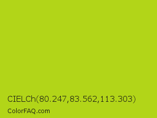 CIELCh 80.247,83.562,113.303 Color is a normal lime color and the nearest color is Inch Worm #b0e313. Hex code #b2d518 and RGB value is rgb(178,213,24). In RGB color space, this color is composed of 70% red, 84% green, 9% blue, In CMYK color space, this color is composed of 16% cyan, 0% magenta, 89% yellow , 16% black , In HSL color space, this color has a hue angle of 71° , 80% saturation and 46% lightness.