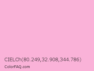 CIELCh 80.249,32.908,344.786 Color is a very light rose color and the nearest color is Lavender Pink #fbaed2. Hex code #fab2d8 and RGB value is rgb(250,178,216). In RGB color space, this color is composed of 98% red, 70% green, 85% blue, In CMYK color space, this color is composed of 0% cyan, 29% magenta, 14% yellow , 2% black , In HSL color space, this color has a hue angle of 328° , 88% saturation and 84% lightness.