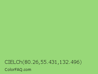 CIELCh 80.26,55.431,132.496 Color is a light green color and the nearest color is Pistachio #93c572. Hex code #98d878 and RGB value is rgb(152,216,120). In RGB color space, this color is composed of 60% red, 85% green, 47% blue, In CMYK color space, this color is composed of 30% cyan, 0% magenta, 44% yellow , 15% black , In HSL color space, this color has a hue angle of 100° , 55% saturation and 66% lightness.