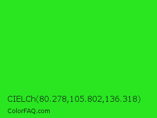 CIELCh 80.278,105.802,136.318 Color is a normal green color and the nearest color is Lime Green #32cd32. Hex code #29e621 and RGB value is rgb(41,230,33). In RGB color space, this color is composed of 16% red, 90% green, 13% blue, In CMYK color space, this color is composed of 82% cyan, 0% magenta, 86% yellow , 10% black , In HSL color space, this color has a hue angle of 118° , 80% saturation and 52% lightness.