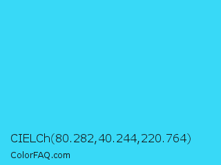 CIELCh 80.282,40.244,220.764 Color is a normal cyan color and the nearest color is Turquoise #40e0d0. Hex code #38d9f7 and RGB value is rgb(56,217,247). In RGB color space, this color is composed of 22% red, 85% green, 97% blue, In CMYK color space, this color is composed of 77% cyan, 12% magenta, 0% yellow , 3% black , In HSL color space, this color has a hue angle of 189° , 92% saturation and 59% lightness.
