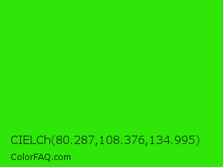 CIELCh 80.287,108.376,134.995 Color is a normal green color and the nearest color is Neon Green #39ff14. Hex code #2ee608 and RGB value is rgb(46,230,8). In RGB color space, this color is composed of 18% red, 90% green, 3% blue, In CMYK color space, this color is composed of 80% cyan, 0% magenta, 97% yellow , 10% black , In HSL color space, this color has a hue angle of 110° , 93% saturation and 47% lightness.