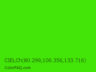 CIELCh 80.299,106.356,133.716 Color is a normal green color and the nearest color is Harlequin #3fff00. Hex code #42e507 and RGB value is rgb(66,229,7). In RGB color space, this color is composed of 26% red, 90% green, 3% blue, In CMYK color space, this color is composed of 71% cyan, 0% magenta, 97% yellow , 10% black , In HSL color space, this color has a hue angle of 104° , 94% saturation and 46% lightness.