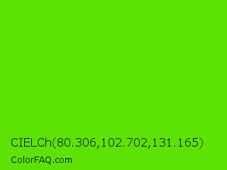 CIELCh 80.306,102.702,131.165 Color is a normal green color and the nearest color is Bright Green #66ff00. Hex code #5ce305 and RGB value is rgb(92,227,5). In RGB color space, this color is composed of 36% red, 89% green, 2% blue, In CMYK color space, this color is composed of 59% cyan, 0% magenta, 98% yellow , 11% black , In HSL color space, this color has a hue angle of 96° , 96% saturation and 45% lightness.
