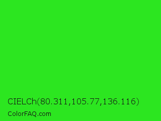 CIELCh 80.311,105.77,136.116 Color is a normal green color and the nearest color is Neon Green #39ff14. Hex code #2ce620 and RGB value is rgb(44,230,32). In RGB color space, this color is composed of 17% red, 90% green, 13% blue, In CMYK color space, this color is composed of 81% cyan, 0% magenta, 86% yellow , 10% black , In HSL color space, this color has a hue angle of 116° , 80% saturation and 51% lightness.
