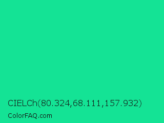 CIELCh 80.324,68.111,157.932 Color is a normal green color and the nearest color is Caribbean Green #00cc99. Hex code #14e395 and RGB value is rgb(20,227,149). In RGB color space, this color is composed of 8% red, 89% green, 58% blue, In CMYK color space, this color is composed of 91% cyan, 0% magenta, 34% yellow , 11% black , In HSL color space, this color has a hue angle of 157° , 84% saturation and 48% lightness.