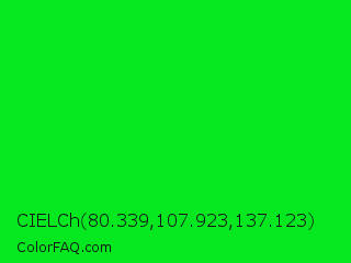 CIELCh 80.339,107.923,137.123 Color is a normal green color and the nearest color is Vivid Malachite #00cc33. Hex code #05e71f and RGB value is rgb(5,231,31). In RGB color space, this color is composed of 2% red, 91% green, 12% blue, In CMYK color space, this color is composed of 98% cyan, 0% magenta, 87% yellow , 9% black , In HSL color space, this color has a hue angle of 127° , 96% saturation and 46% lightness.