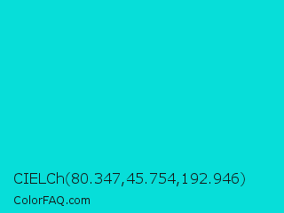 CIELCh 80.347,45.754,192.946 Color is a normal cyan color and the nearest color is Bright Turquoise #08e8de. Hex code #07ded9 and RGB value is rgb(7,222,217). In RGB color space, this color is composed of 3% red, 87% green, 85% blue, In CMYK color space, this color is composed of 97% cyan, 0% magenta, 2% yellow , 13% black , In HSL color space, this color has a hue angle of 179° , 94% saturation and 45% lightness.