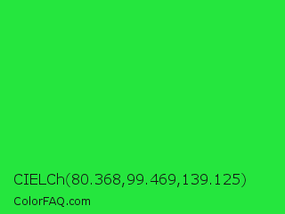 CIELCh 80.368,99.469,139.125 Color is a normal green color and the nearest color is Lime Green #32cd32. Hex code #25e63e and RGB value is rgb(37,230,62). In RGB color space, this color is composed of 15% red, 90% green, 24% blue, In CMYK color space, this color is composed of 84% cyan, 0% magenta, 73% yellow , 10% black , In HSL color space, this color has a hue angle of 128° , 79% saturation and 52% lightness.
