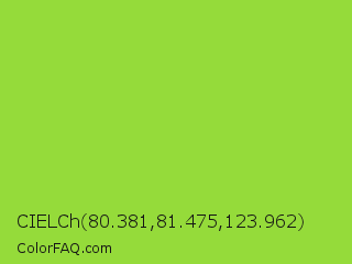 CIELCh 80.381,81.475,123.962 Color is a normal green color and the nearest color is Kiwi #8ee53f. Hex code #95db3a and RGB value is rgb(149,219,58). In RGB color space, this color is composed of 58% red, 86% green, 23% blue, In CMYK color space, this color is composed of 32% cyan, 0% magenta, 74% yellow , 14% black , In HSL color space, this color has a hue angle of 86° , 69% saturation and 54% lightness.