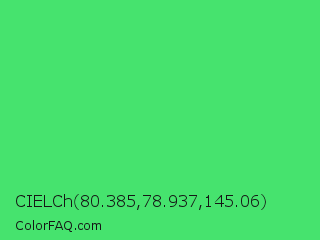 CIELCh 80.385,78.937,145.06 Color is a normal green color and the nearest color is UFO Green #3cd070. Hex code #46e36e and RGB value is rgb(70,227,110). In RGB color space, this color is composed of 27% red, 89% green, 43% blue, In CMYK color space, this color is composed of 69% cyan, 0% magenta, 52% yellow , 11% black , In HSL color space, this color has a hue angle of 135° , 74% saturation and 58% lightness.