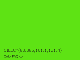 CIELCh 80.386,101.1,131.4 Color is a normal green color and the nearest color is Harlequin Green #46cb18. Hex code #5ee314 and RGB value is rgb(94,227,20). In RGB color space, this color is composed of 37% red, 89% green, 8% blue, In CMYK color space, this color is composed of 59% cyan, 0% magenta, 91% yellow , 11% black , In HSL color space, this color has a hue angle of 99° , 84% saturation and 48% lightness.