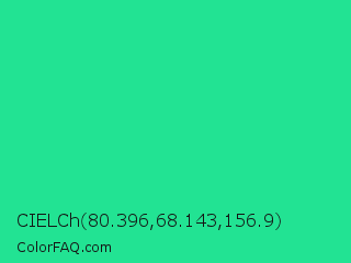 CIELCh 80.396,68.143,156.9 Color is a normal green color and the nearest color is Shamrock #33cc99. Hex code #22e393 and RGB value is rgb(34,227,147). In RGB color space, this color is composed of 13% red, 89% green, 58% blue, In CMYK color space, this color is composed of 85% cyan, 0% magenta, 35% yellow , 11% black , In HSL color space, this color has a hue angle of 155° , 78% saturation and 51% lightness.