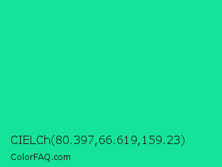 CIELCh 80.397,66.619,159.23 Color is a normal green color and the nearest color is Caribbean Green #00cc99. Hex code #14e399 and RGB value is rgb(20,227,153). In RGB color space, this color is composed of 8% red, 89% green, 60% blue, In CMYK color space, this color is composed of 91% cyan, 0% magenta, 33% yellow , 11% black , In HSL color space, this color has a hue angle of 159° , 84% saturation and 48% lightness.