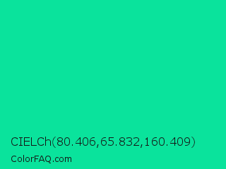 CIELCh 80.406,65.832,160.409 Color is a normal green color and the nearest color is Medium Spring Green #00fa9a. Hex code #0ae39c and RGB value is rgb(10,227,156). In RGB color space, this color is composed of 4% red, 89% green, 61% blue, In CMYK color space, this color is composed of 96% cyan, 0% magenta, 31% yellow , 11% black , In HSL color space, this color has a hue angle of 160° , 92% saturation and 46% lightness.