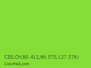 CIELCh 80.412,86.575,127.576 Color is a normal green color and the nearest color is Kiwi #8ee53f. Hex code #84de36 and RGB value is rgb(132,222,54). In RGB color space, this color is composed of 52% red, 87% green, 21% blue, In CMYK color space, this color is composed of 41% cyan, 0% magenta, 76% yellow , 13% black , In HSL color space, this color has a hue angle of 92° , 72% saturation and 54% lightness.