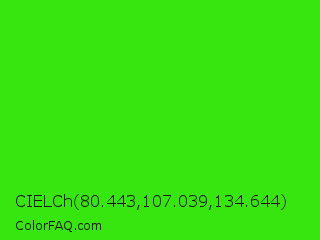 CIELCh 80.443,107.039,134.644 Color is a normal green color and the nearest color is Neon Green #39ff14. Hex code #38e60f and RGB value is rgb(56,230,15). In RGB color space, this color is composed of 22% red, 90% green, 6% blue, In CMYK color space, this color is composed of 76% cyan, 0% magenta, 93% yellow , 10% black , In HSL color space, this color has a hue angle of 109° , 88% saturation and 48% lightness.