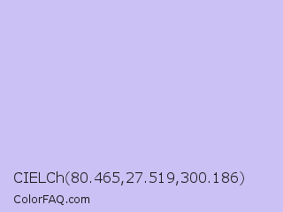 CIELCh 80.465,27.519,300.186 Color is a very light indigo color and the nearest color is Perfume #d0bef8. Hex code #ccc1f4 and RGB value is rgb(204,193,244). In RGB color space, this color is composed of 80% red, 76% green, 96% blue, In CMYK color space, this color is composed of 16% cyan, 21% magenta, 0% yellow , 4% black , In HSL color space, this color has a hue angle of 253° , 70% saturation and 86% lightness.