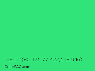 CIELCh 80.471,77.422,148.946 Color is a normal green color and the nearest color is UFO Green #3cd070. Hex code #31e479 and RGB value is rgb(49,228,121). In RGB color space, this color is composed of 19% red, 89% green, 47% blue, In CMYK color space, this color is composed of 79% cyan, 0% magenta, 47% yellow , 11% black , In HSL color space, this color has a hue angle of 144° , 77% saturation and 54% lightness.