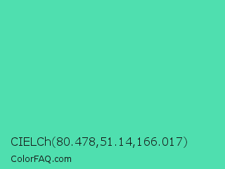 CIELCh 80.478,51.14,166.017 Color is a normal green color and the nearest color is Eucalyptus #44d7a8. Hex code #4fdfaf and RGB value is rgb(79,223,175). In RGB color space, this color is composed of 31% red, 87% green, 69% blue, In CMYK color space, this color is composed of 65% cyan, 0% magenta, 22% yellow , 13% black , In HSL color space, this color has a hue angle of 160° , 69% saturation and 59% lightness.
