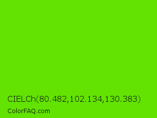 CIELCh 80.482,102.134,130.383 Color is a normal green color and the nearest color is Bright Green #66ff00. Hex code #62e302 and RGB value is rgb(98,227,2). In RGB color space, this color is composed of 38% red, 89% green, 1% blue, In CMYK color space, this color is composed of 57% cyan, 0% magenta, 99% yellow , 11% black , In HSL color space, this color has a hue angle of 94° , 98% saturation and 45% lightness.