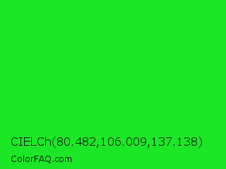 CIELCh 80.482,106.009,137.138 Color is a normal green color and the nearest color is Lime Green #32cd32. Hex code #1ce726 and RGB value is rgb(28,231,38). In RGB color space, this color is composed of 11% red, 91% green, 15% blue, In CMYK color space, this color is composed of 88% cyan, 0% magenta, 84% yellow , 9% black , In HSL color space, this color has a hue angle of 123° , 81% saturation and 51% lightness.