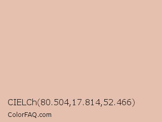 CIELCh 80.504,17.814,52.466 Color is a light orange color and the nearest color is Zinnwaldite #ebc2af. Hex code #e6c0ae and RGB value is rgb(230,192,174). In RGB color space, this color is composed of 90% red, 75% green, 68% blue, In CMYK color space, this color is composed of 0% cyan, 17% magenta, 24% yellow , 10% black , In HSL color space, this color has a hue angle of 19° , 53% saturation and 79% lightness.