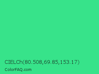 CIELCh 80.508,69.85,153.17 Color is a normal green color and the nearest color is Shamrock #33cc99. Hex code #37e38a and RGB value is rgb(55,227,138). In RGB color space, this color is composed of 22% red, 89% green, 54% blue, In CMYK color space, this color is composed of 76% cyan, 0% magenta, 39% yellow , 11% black , In HSL color space, this color has a hue angle of 149° , 75% saturation and 55% lightness.
