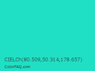 CIELCh 80.509,50.314,178.657 Color is a normal cyan color and the nearest color is Turquoise PWG #30d5c8. Hex code #1fe0c4 and RGB value is rgb(31,224,196). In RGB color space, this color is composed of 12% red, 88% green, 77% blue, In CMYK color space, this color is composed of 86% cyan, 0% magenta, 13% yellow , 12% black , In HSL color space, this color has a hue angle of 171° , 76% saturation and 50% lightness.