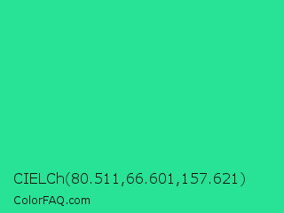 CIELCh 80.511,66.601,157.621 Color is a normal green color and the nearest color is Shamrock #33cc99. Hex code #28e396 and RGB value is rgb(40,227,150). In RGB color space, this color is composed of 16% red, 89% green, 59% blue, In CMYK color space, this color is composed of 82% cyan, 0% magenta, 34% yellow , 11% black , In HSL color space, this color has a hue angle of 155° , 77% saturation and 52% lightness.